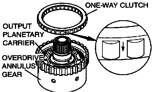 Insert the one-way clutch into the overdrive annulus gear so that the arrow points towards the output planetary carrier.