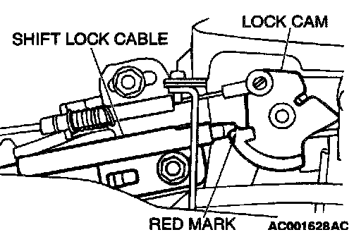 2. Fasten the shift lock cable at the position where the end of the shift lock cable is positioned above the red marking.