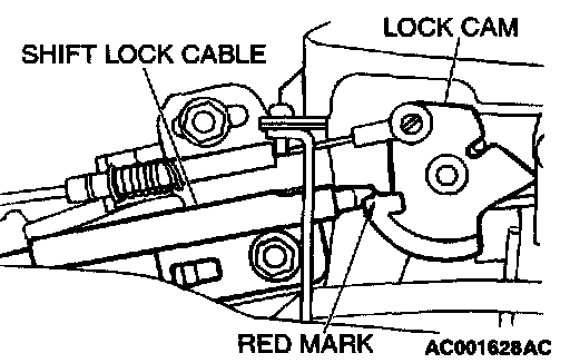 2. Fasten the shift lock cable at the position where the end of the shift lock cable is positioned above the red marking.
