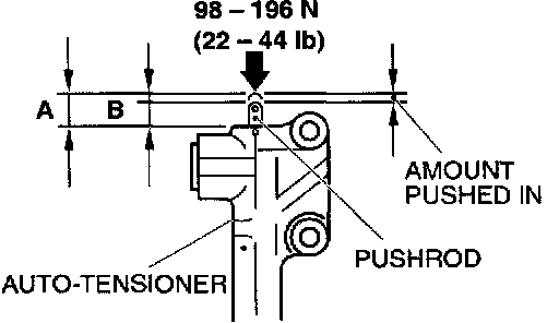 1. Apply 98 - 196 N (22 - 44 pound) force to the pushrod of the auto-tensioner by pressing it against a metal object (such as the engine block) and measure the movement of the pushrod.
