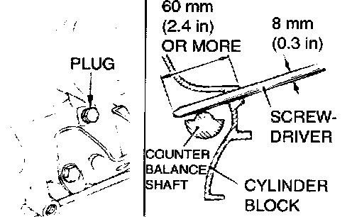 2. After aligning the timing mark on the oil pump sprocket, remove the cylinder block plug and insert a Phillips) head 8 mm (0.3 inch) screwdriver. Check to be sure that the screwdriver goes in 60 mm (2.4 inches) or more. If the screwdriver will only go in 20 - 25 mm (0.8 - 1.0 inch) before striking the counterbalance shaft, turn the sprocket once, realign the timing marks and check that the screwdriver goes in 60 mm (2.4 inches) or more. The screwdriver should not be taken out until the timing belt is installed.