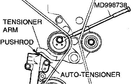 1. Remove the rubber plug from the rear of the timing belt cover assembly. Then screw in special tool MD998738 by hand until the tensioner arm is touching the auto-tensioner pushrod.
