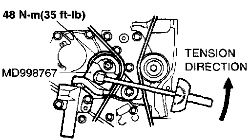 3. Loosen the tension pulley taxing bolt, and then use special tool MD998767 and a torque wrench to tighten the fixing bolt to the specified torque while applying tension to the timing belt.