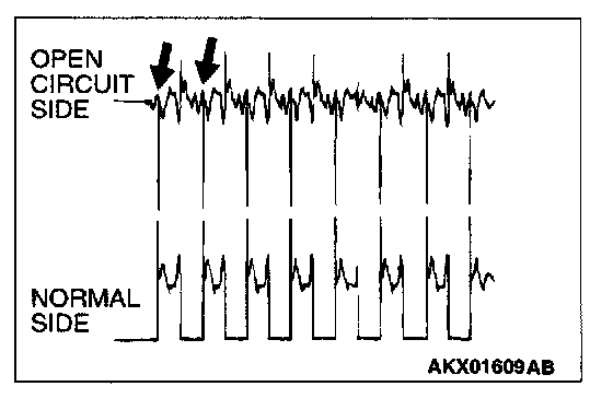 Current is not supplied to the motor coil on the open circuit side. (Voltage does not drop to 0 volt.) Furthermore, the induced electromotive force wave pattern at the normal side is slightly different from the normal wave pattern.