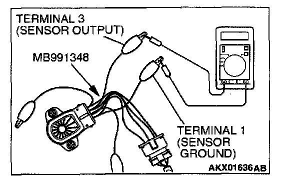 1. Disconnect the throttle position sensor connector, and connector the special tool MB991348 in between. (All terminals should be connected.)