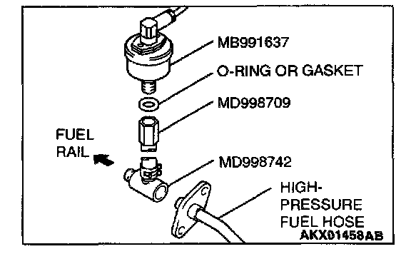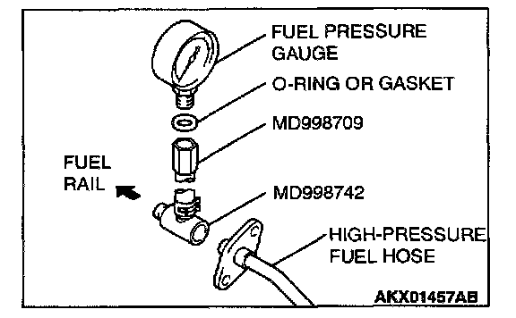 2. Place a suitable O-ring or gasket on assembled special tools MD998709 and MD998742 and install the fuel pressure gauge.