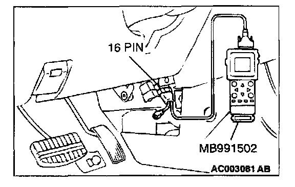 CAUTION: To prevent damage to scan tool MB991502, always turn the ignition switch to the "LOCK" (OFF) position before connecting or disconnecting scan tool MB991502.