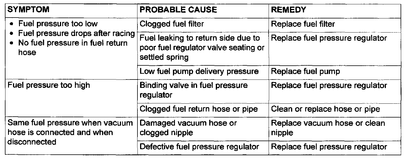 12. If any of fuel pressure measured in steps 10 to 13 is out of specification, troubleshoot and repair according to the table.
