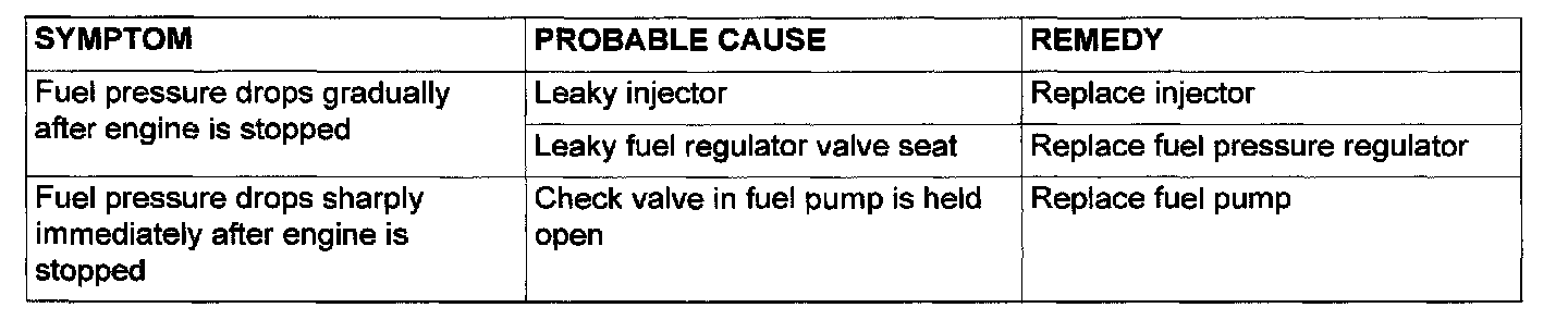 13. Stop the engine and observe fuel pressure gauge reading. It is normal if the reading does not drop within two minutes. If it does, observe the rate of drop and troubleshoot and repair according to the table. Start, then stop the engine.