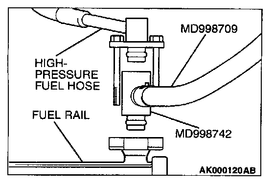 15. Remove the fuel pressure gauge, and special tools MD998709 and MD998742 from the fuel rail.