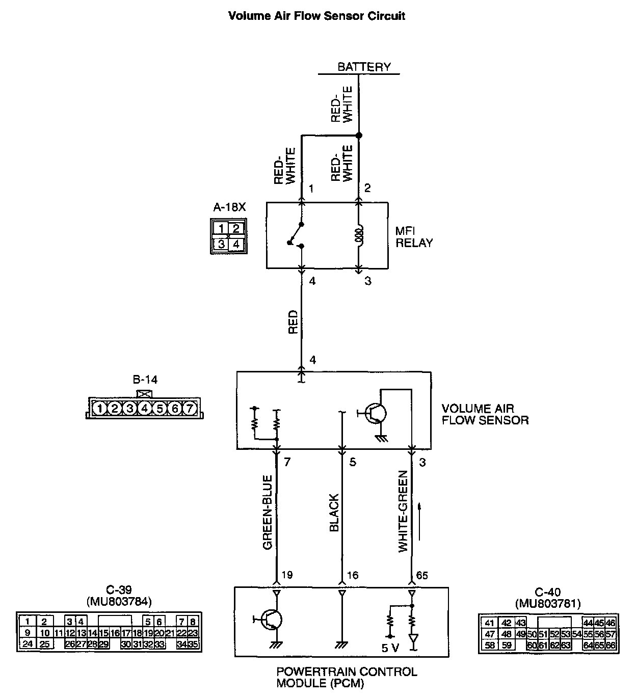 - The volume air flow sensor power is supplied from the MFI relay (terminal 4), and the ground is provided on the PCM (terminal 16).