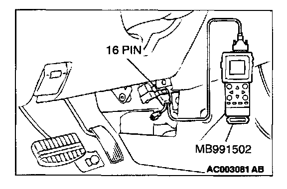 CAUTION: To prevent damage to scan tool MB991502, always turn the ignition switch to the "LOCK" (OFF) position before connecting or disconnecting scan tool MB991502.