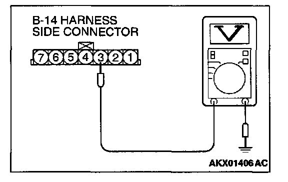 STEP 3. Check the power supply voltage at volume air flow sensor harness side connector B-14.