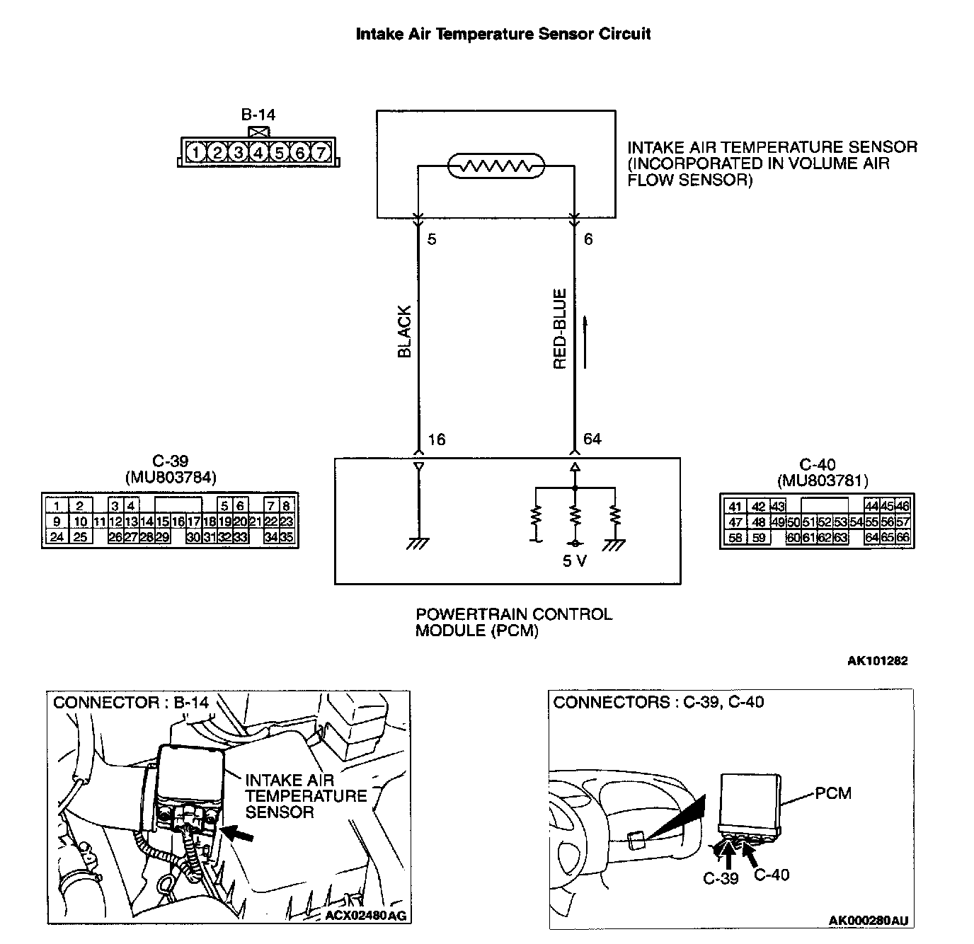 - Approximately 5 volts are applied to the intake air temperature sensor output terminal (terminal 6) from the PCM (terminal 64) via the resistor in the PCM. The ground terminal (terminal 5) is grounded with PCM (terminal 16).
