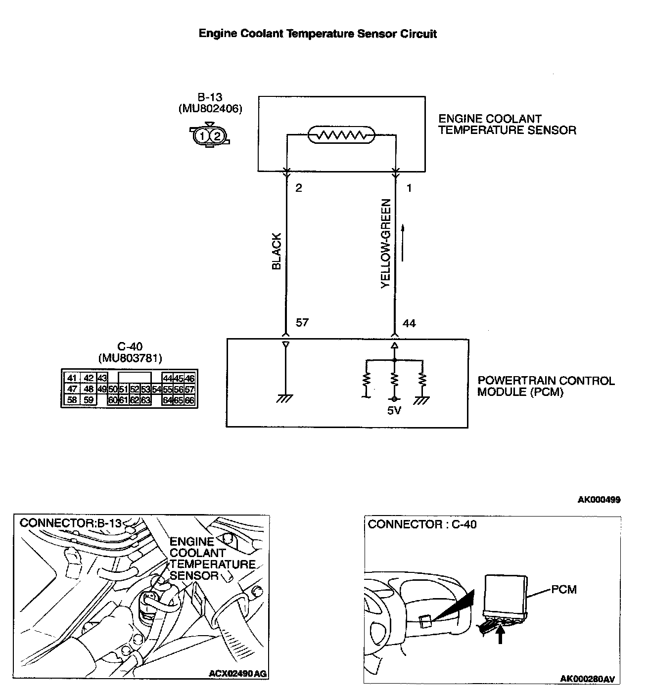- 5-volt voltage is applied to the engine coolant temperature sensor output terminal (terminal 1) from the PCM (terminal 44) via the resistor in the PCM. The ground terminal (terminal 2) is grounded with PCM (terminal 57).