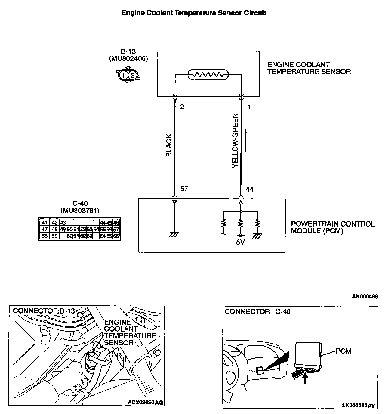 - 5-volt voltage is applied to the engine coolant temperature sensor output terminal (terminal 1) from the PCM (terminal 44) via the resistor in the PCM. The ground terminal (terminal 2) is grounded with PCM (terminal 57).