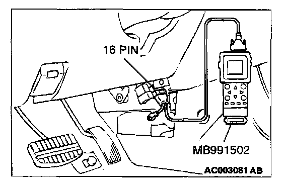 CAUTION: To prevent damage to scan tool MB991502, always turn the ignition switch to the "LOCK" (OFF) position before connecting or disconnecting scan tool MB991502.