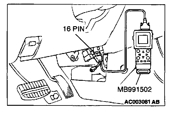 CAUTION: To prevent damage to scan tool MB991502, always turn the ignition switch to the "LOCK" (OFF) position before connecting or disconnecting scan tool MB991502.