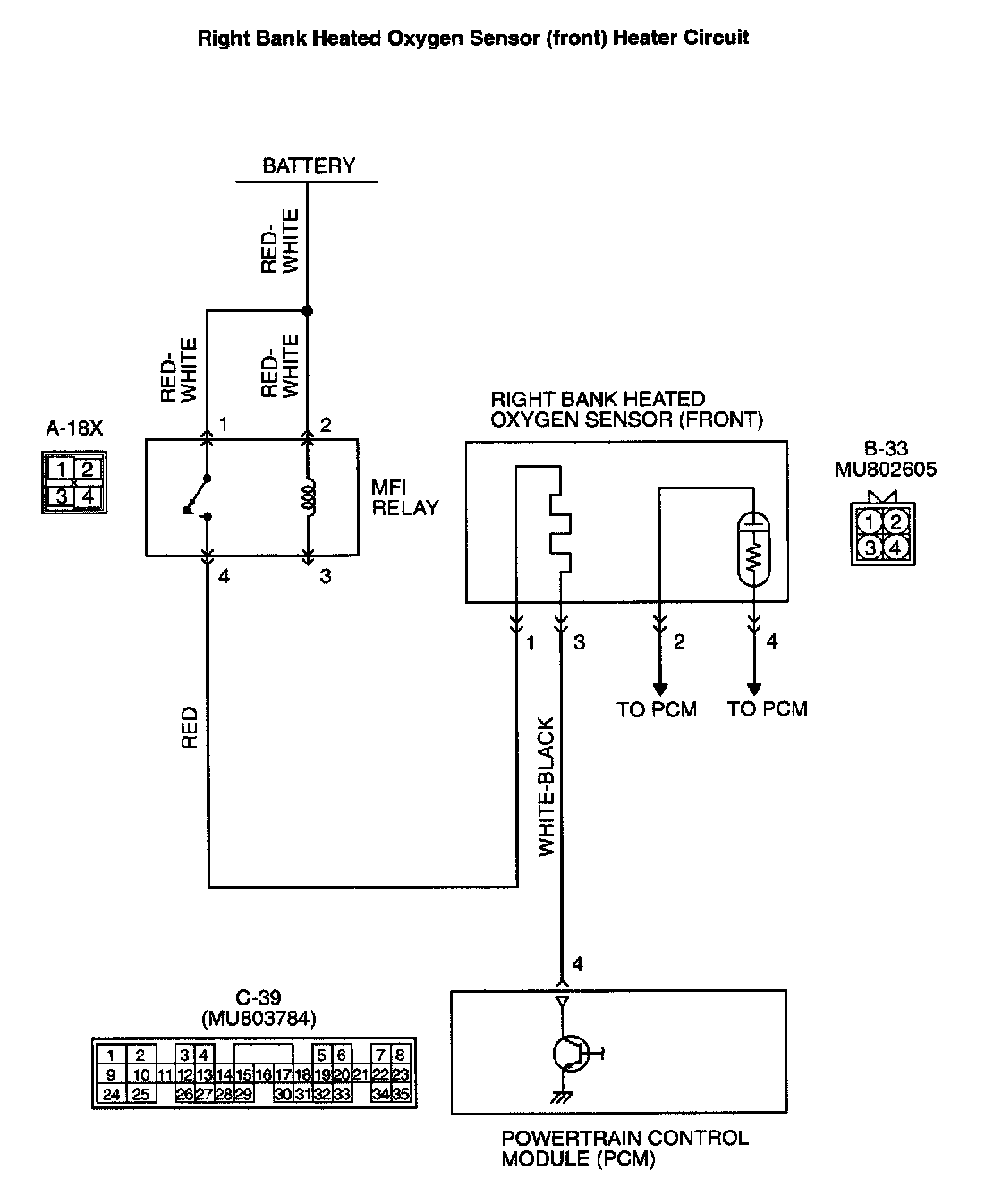 - Power is supplied from the MFI relay (terminal 4) to the right bank heated oxygen sensor (front) heater.