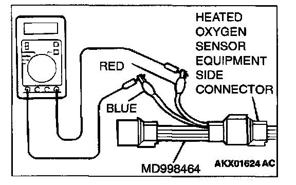 2. Measure the resistance between heated oxygen sensor connector terminal 1 (red dip) and terminal 3 (blue clip).