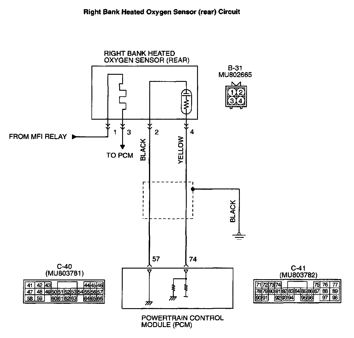 - A voltage corresponding to the oxygen concentration in the exhaust gas is sent to the PCM (terminal 74) from the output terminal (terminal 4) of the right bank heated oxygen sensor (rear).