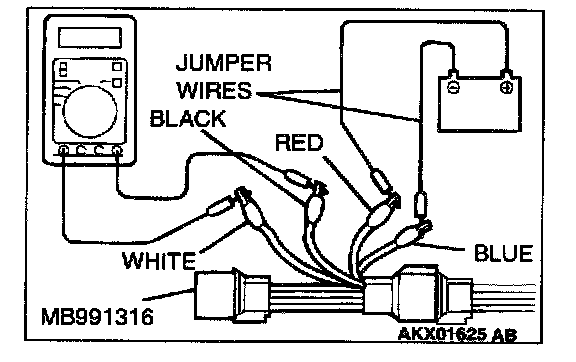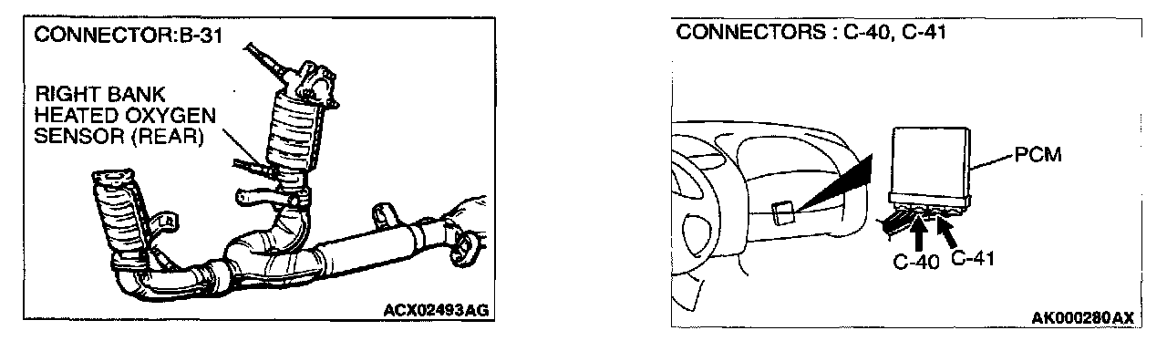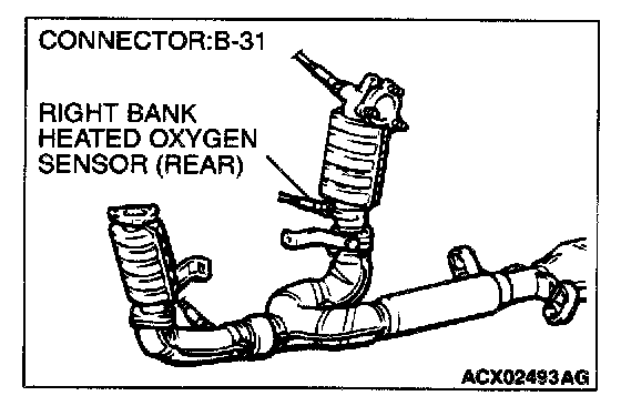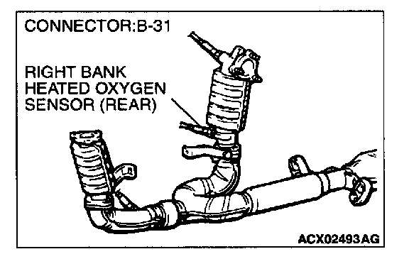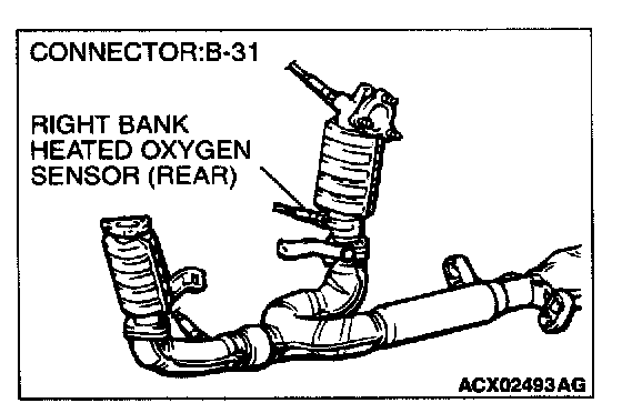 1. Disconnect the right bank heated oxygen sensor (rear) connector B-31 and connect test harness special tool, MB991316, to the connector on the right bank heated oxygen sensor (front) side.