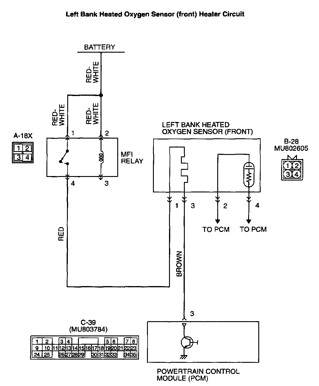 - Power is supplied from the MFI relay (terminal 4) to the left bank heated oxygen sensor (front) heater.