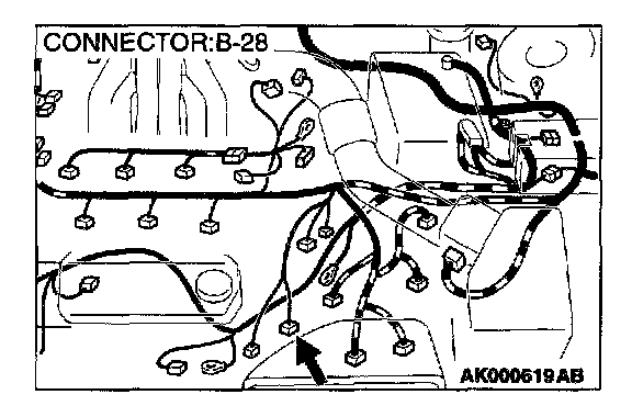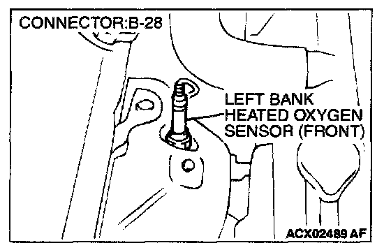 1. Disconnect left bank heated oxygen sensor (front) connector B-28 and connect test harness special tool, MD998464, to the connector on the left bank heated oxygen (front) sensor side.