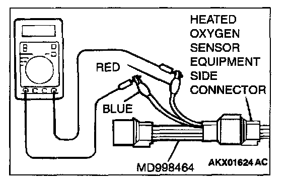 2. Measure the resistance between heated oxygen sensor connector terminal 1 (red clip) and terminal 3 (blue clip).