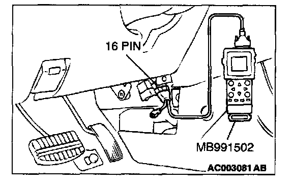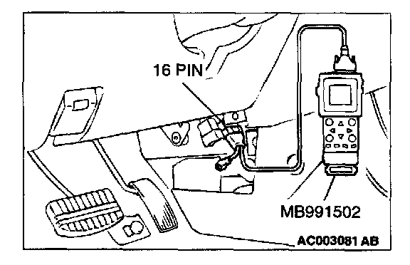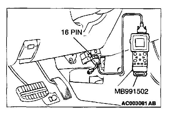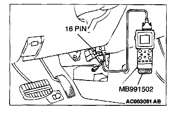 CAUTION: To prevent damage to scan tool MB991502, always turn the ignition switch to the "LOCK" (OFF) position before connecting or disconnecting scan tool MB991502.