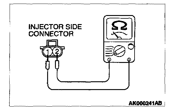 2. Measure the resistance between each injector side connector terminal 1 and 2.