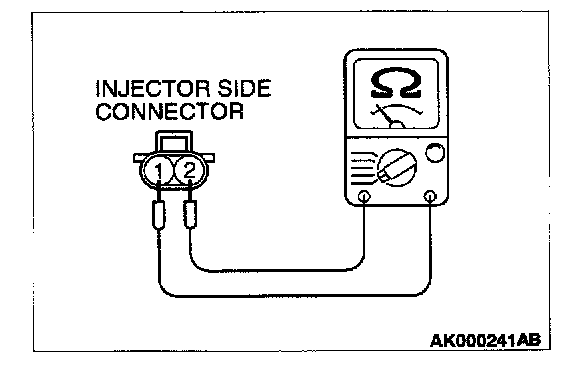 2. Measure the resistance between each injector side connector terminal 1 and 2.