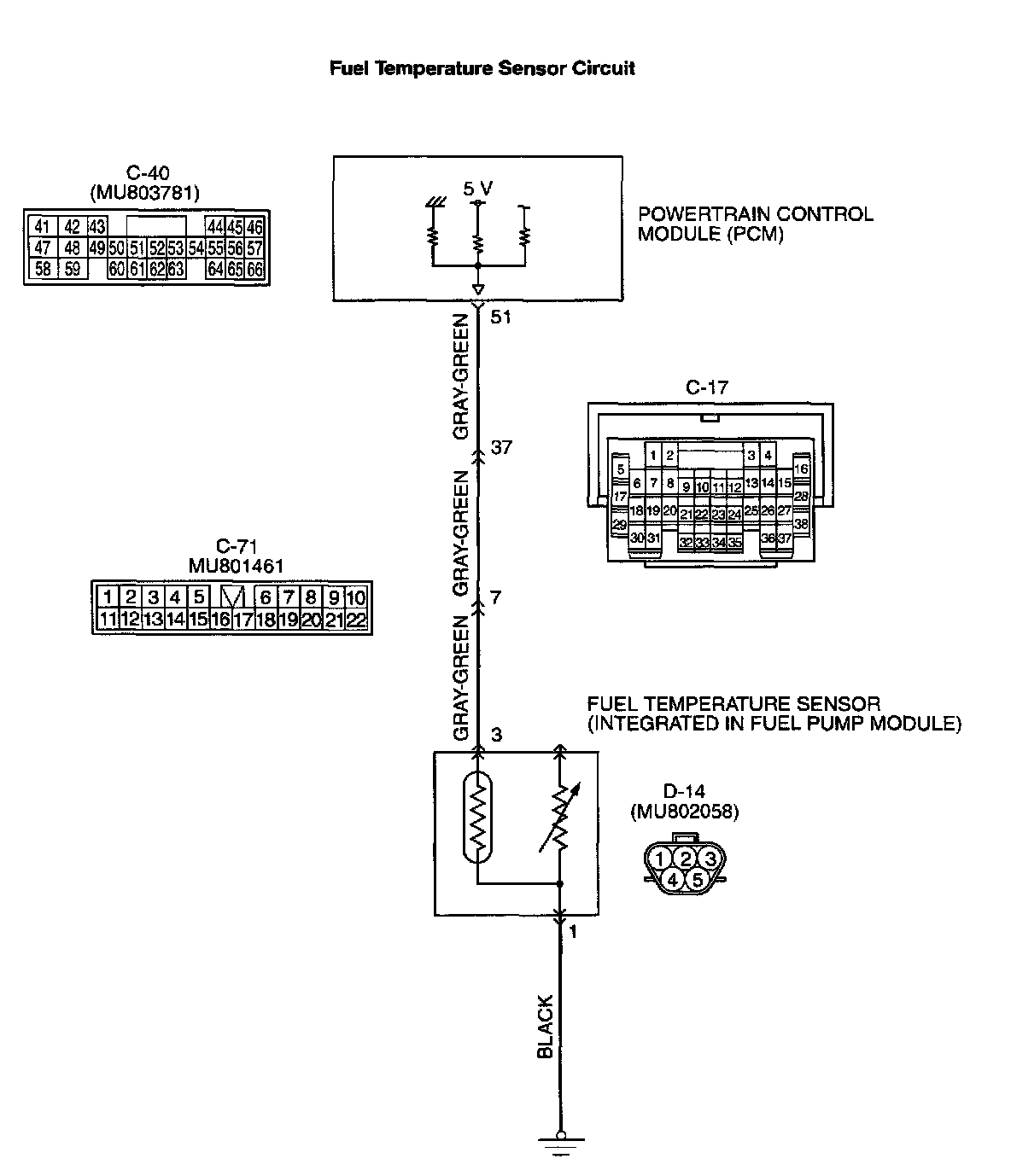 - 5-volt voltage is applied to the fuel temperature sensor output terminal (terminal 3) from the PCM (terminal 51) via the resistor in the PCM.