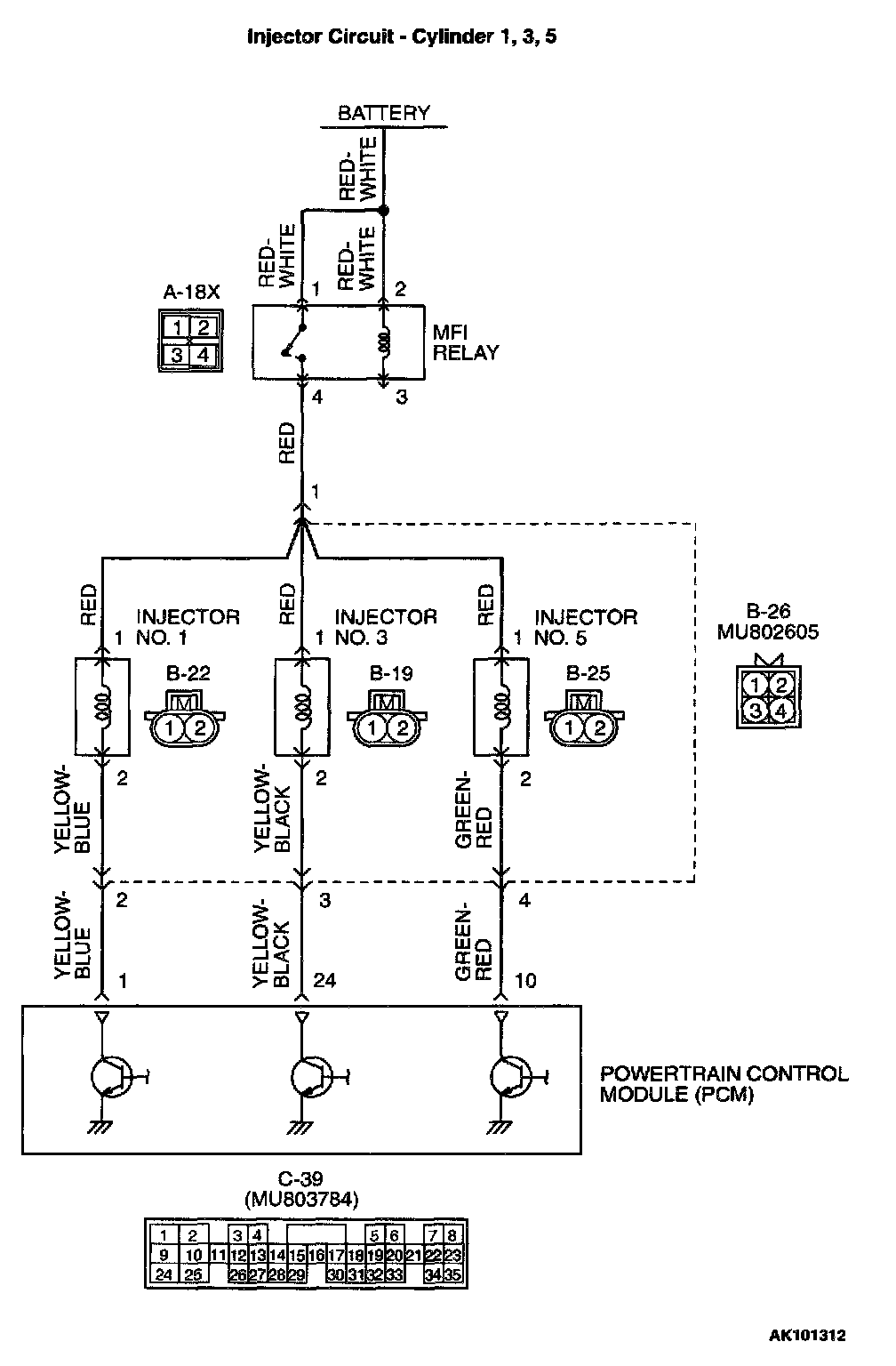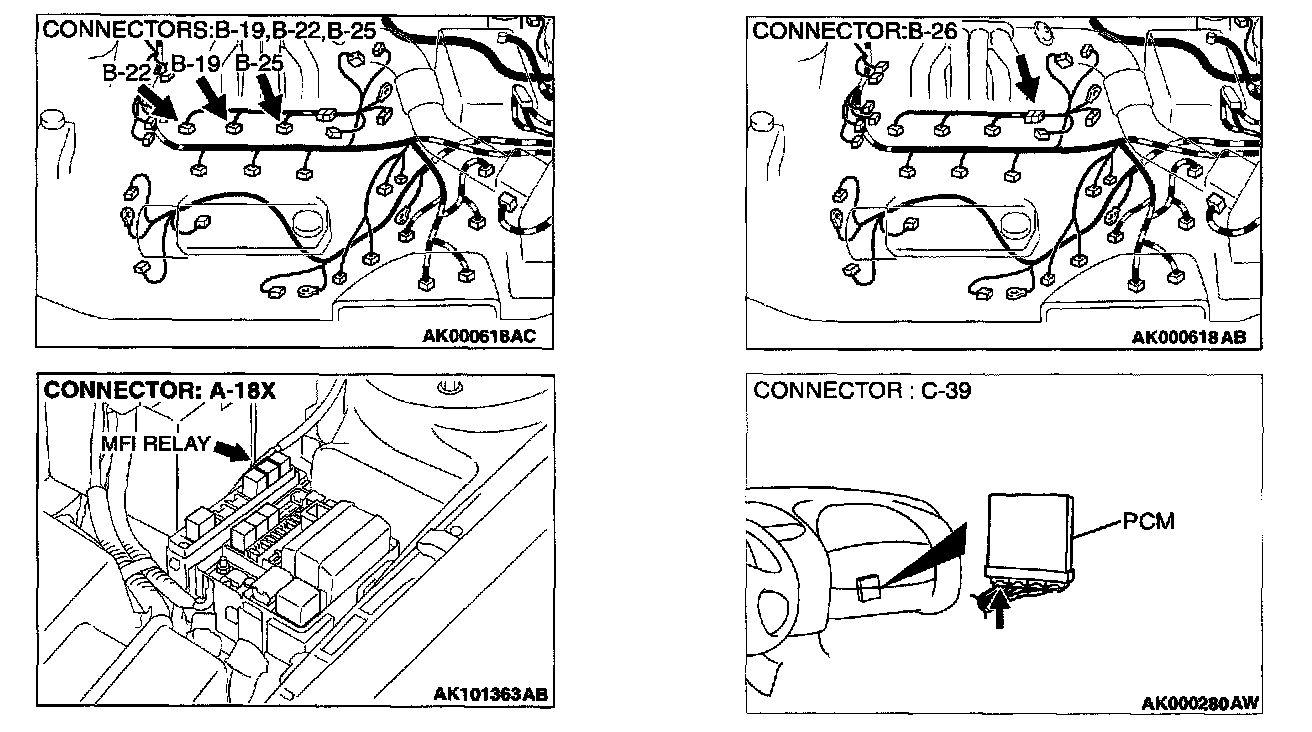STEP 8. Check for harness damage between MFI relay connector A-18X terminal 4 and injector intermediate connector B-26 terminal 1.