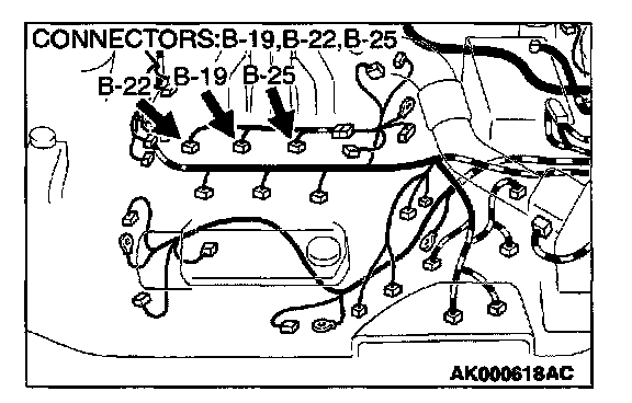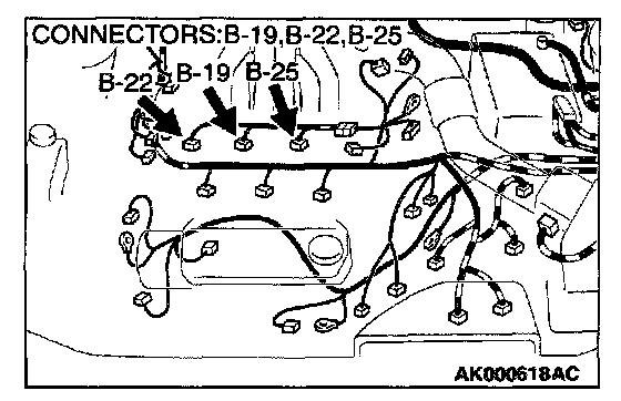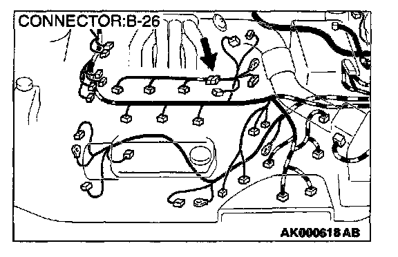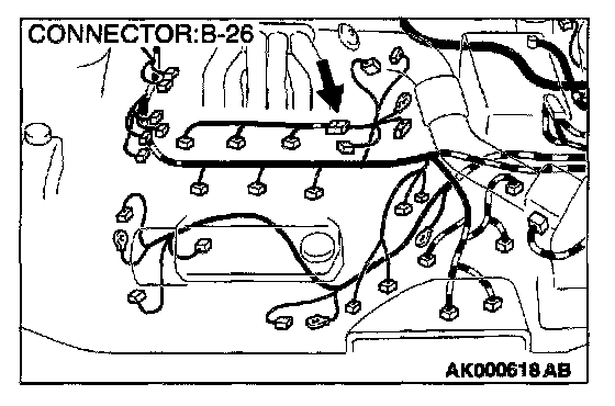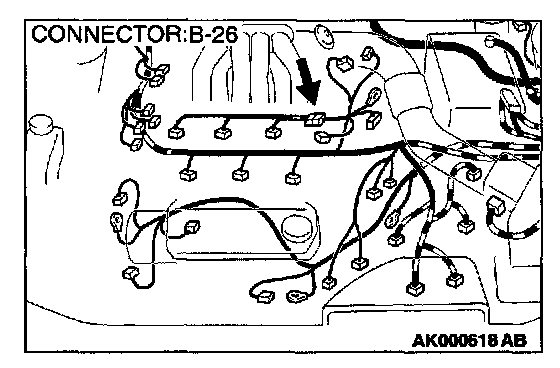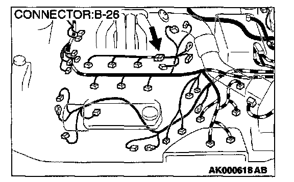 1. Disconnect the injector intermediate connector B-26 and connect the test harness special tool (MD998464) in between.