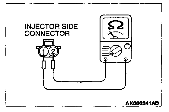 2. Measure the resistance between injector side connector terminal 1 and 2.