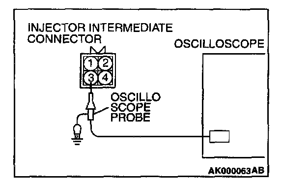 2. Connect the oscilloscope probe to each injector intermediate connector terminal to oscilloscope each cylinder: