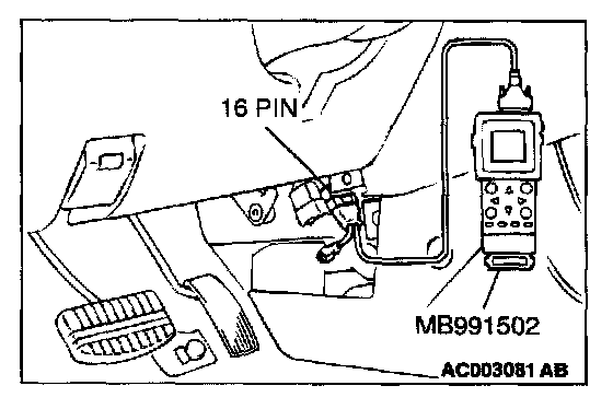 CAUTION: To prevent damage to scan tool MB991502, always turn the ignition switch to the "LOCK" (OFF) position before connecting or disconnecting scan tool MB991502.