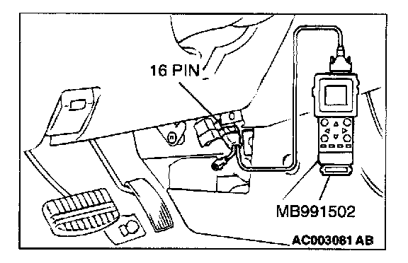 CAUTION: To prevent damage to scan tool MB991502, always turn the ignition switch to the "LOCK" (OFF) position before connecting or disconnecting scan tool MB991502.