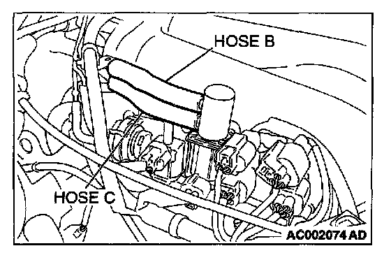 1. Disconnect hoses B and C from the evaporative emission purge solenoid side, and connect the hand vacuum pump to the evaporative emission purge solenoid instead of hose C.