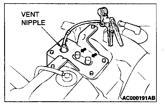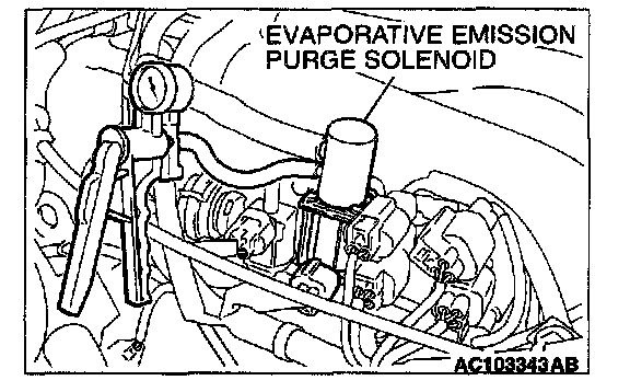 3. Set scan tool MB991502 to actuator test mode for item 08: Evaporative Emission Purge Solenoid. When the evaporative emission purge solenoid is operated, apply a pressure on the hand vacuum pump and confirm that air is blown from the other side nipple.