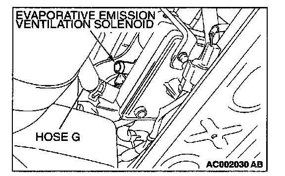 1. Disconnect hose G from the evaporative emission ventilation solenoid side, and plug the hose G