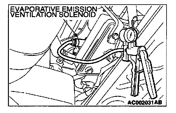 5. Set scan tool MB991502 to actuator test mode for item 29: Evaporative Emission Ventilation Solenoid. When the evaporative emission ventilation solenoid is operated, apply a pressure on the hand vacuum pump and confirm that air is maintained.