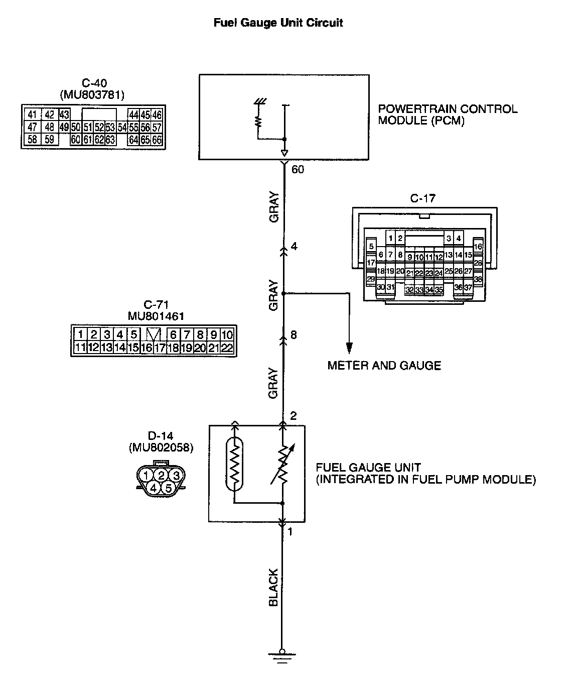STEP 8. Check for short circuit to ground between fuel gauge unit connector D-14 terminal 2 and PCM connector C-40 terminal 60.