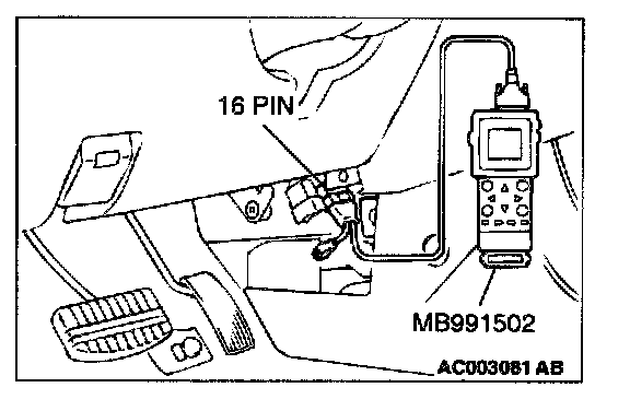 CAUTION: To prevent damage to scan tool MB991502, always turn the ignition switch to the "LOCK" (OFF) position before connecting or disconnecting scan tool MB991502.