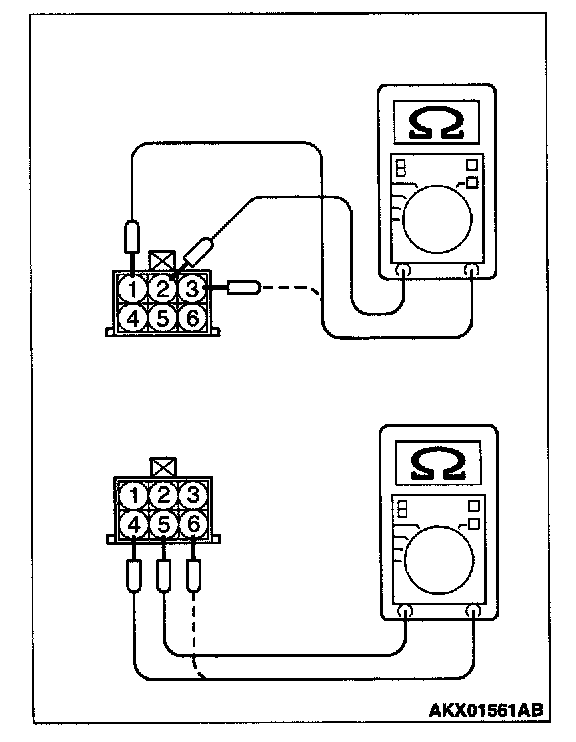 2. Measure the resistance between idle air control motor connector terminal 2 and either terminal 1 or terminal 3.