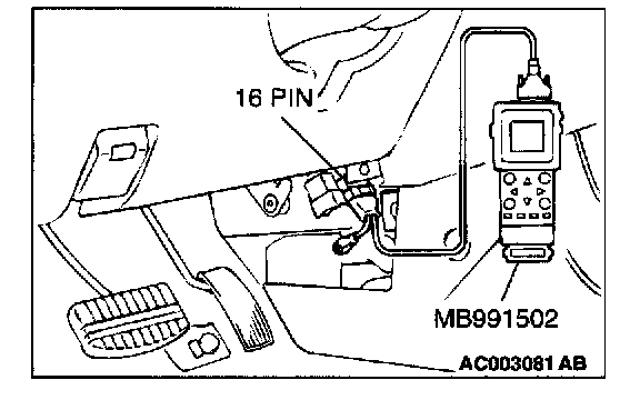 CAUTION: To prevent damage to scan tool MB991502, always turn the ignition switch to the "LOCK" (OFF) position before connecting or disconnecting scan tool MB991502.