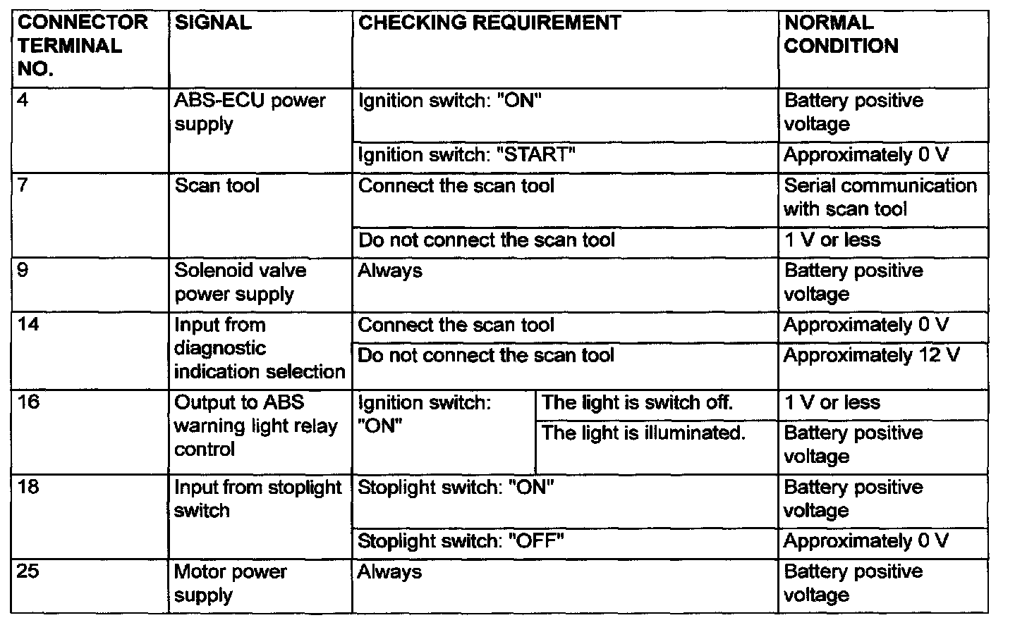 NOTE: Do not measure terminal voltage for approximately three seconds after the ignition switch is turned "ON." The ABS-ECU performs the initial check during that period.