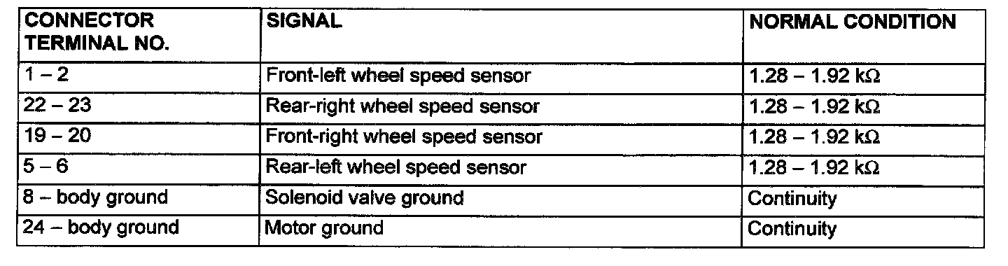 1. Turn the ignition switch to the "LOCK" (OFF) position and disconnect the ABS-ECU connector before checking resistance and continuity.