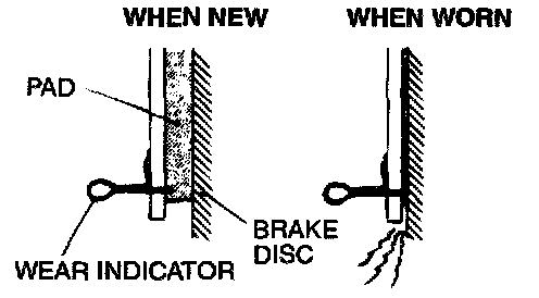 DISC BRAKE PAD CHECK AND REPLACEMENTNOTE: The brake pads have indicators that contact the brake disc when the brake pad thickness becomes 2 mm (0.08 inch), and emit a squealing sound to warn the driver.